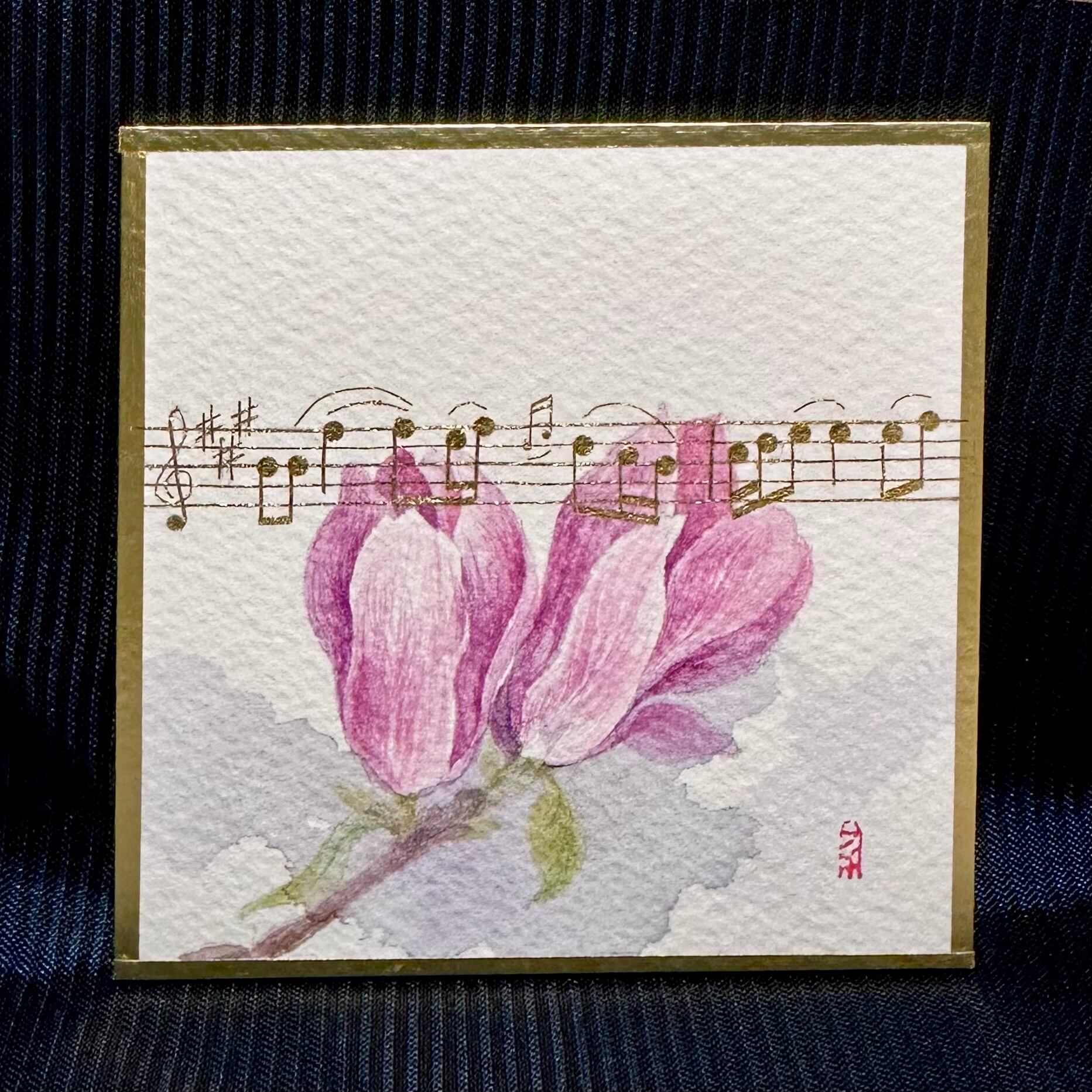彩譜SaiFuは、7.5cmの正方形の水彩色紙に描かれた水彩画と、クラシック音楽の楽譜を截金(きりかね)という伝統技法で描いた作品です。